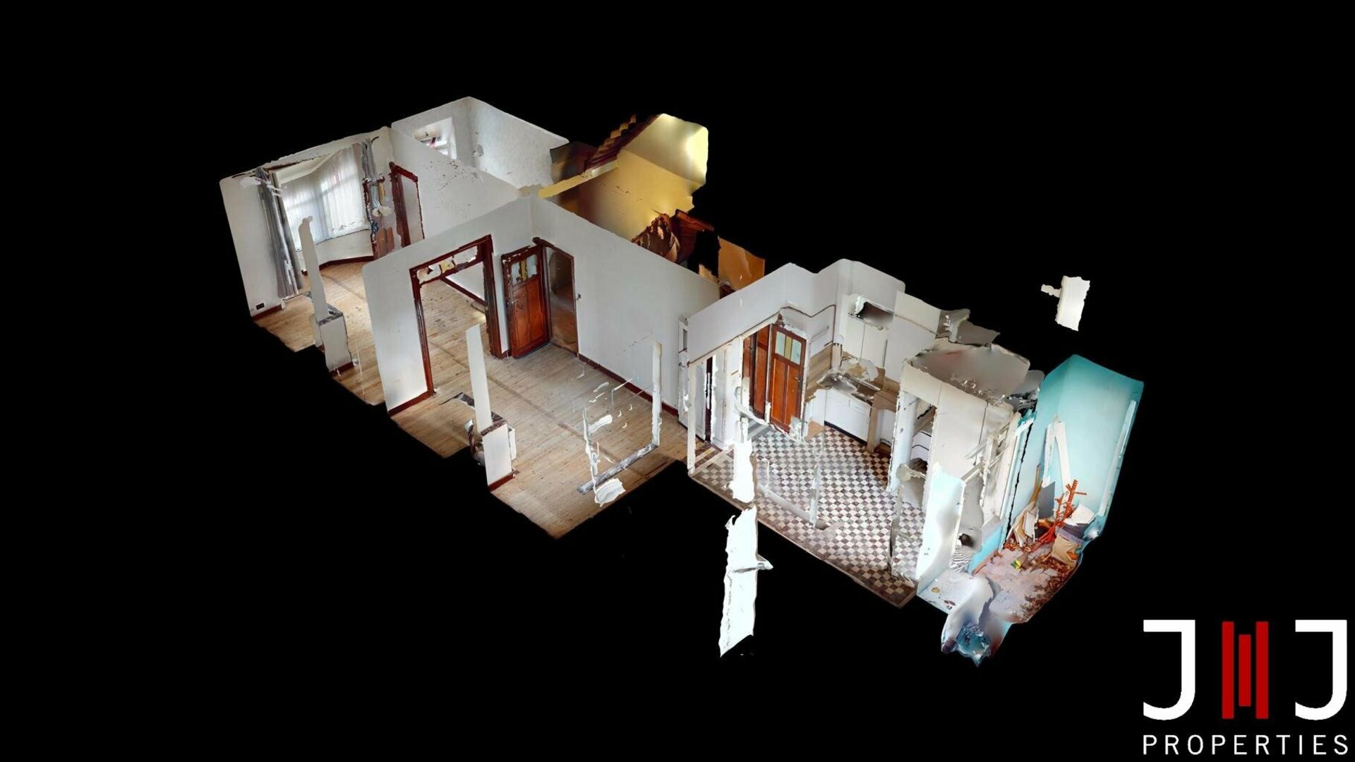- A large living/dining room with two adjoining rooms, a kitchen area, a bathroom area, 2 bedrooms, a toilet, and a balcony. The apartment also benefits from a 7.4m² cellar.